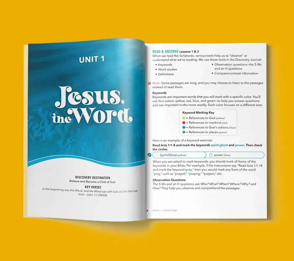The Discovery Journal is an interactive Bible study that guides kids through Scripture using 11 study tools, like keywords, cross-references, background studies, and word studies.